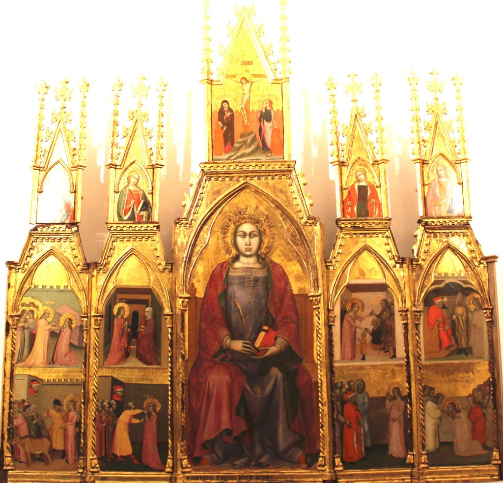 Además de los retablos de Bernabé de Módena, en el museo de la catedral, podemos ver el retablo de San Miguel de estilo gótico valenciano, conocido también como de Puxmarín porque lo encargó un canónigo apellidado así a finales del siglo XV. Es un retablo pictórico de grandes dimensiones con una iconografía muy interesante del cielo, el purgatorio y el infierno. Si estirásemos la Baja Edad Media hasta principios del siglo XVI, podríamos citar el retablo de la iglesia Santiago de Murcia, probablemente la única iglesia medieval que el barroco dejó en pie en la ciudad, pero que resultó lamentablemente incendiada en la guerra civil, así que la que vemos hoy es una reconstrucción de época franquista. Afortunadamente, parte del retablo se salvó del incendio y hoy se puede ver en el Museo de Bellas Artes de Murcia. Es un retablo que recoge la tradición pictórica del siglo XV con varias imágenes que cuentan la historia de Santiago.