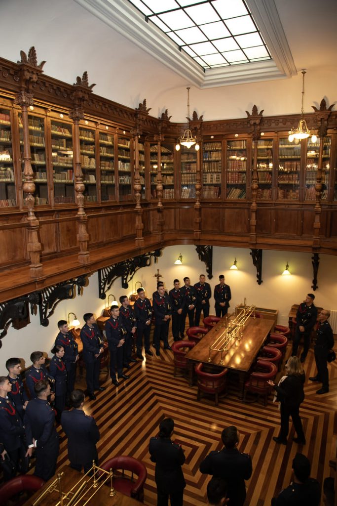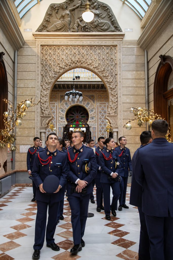 La visita se desarrolló en varios grupos y consistió en un recorrido guiado por la Planta Baja Monumental del edificio, uno de los espacios más emblemáticos del patrimonio arquitectónico y artístico de la ciudad. A lo largo del itinerario, los cadetes conocieron de primera mano la historia del Real Casino de Murcia, su evolución desde el siglo XIX hasta la actualidad y el valor patrimonial de salas tan significativas como el Patio Árabe, la Biblioteca o el Salón de Baile, ejemplos destacados de la convivencia de estilos y de la riqueza cultural que caracteriza a la institución.