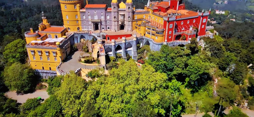 Nuestro primer destino fue el maravilloso Palacio da Pena, residencia de la familia real portuguesa durante el siglo XIX. En mi opinión, es el más bonito de Sintra y también uno de los más espectaculares de Europa. Está situado en lo alto de la sierra de Sintra y lo rodea un jardín botánico con muchísimas especies de plantas. Fue construido con una arquitectura ecléctica, mezclando varios estilos, unos inspirados en el romanticismo y otros con azulejos típicos portugueses. Al principio fue un monasterio de frailes jerónimos. Cuando éstos se trasladaron a la zona de Belem, cerca de Lisboa, el rey Fernando II les compró sus ruinas y ordenó construir el palacio como regalo a su esposa, María II de Portugal.