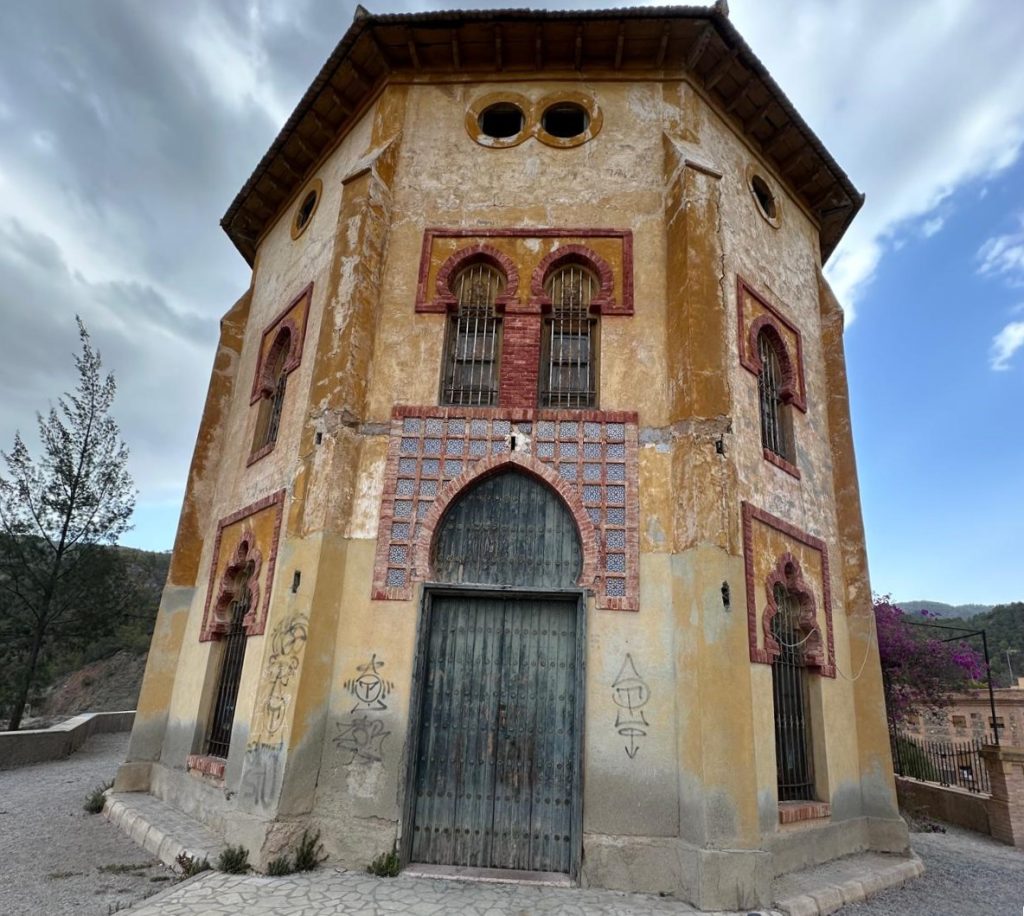 El edificio es del siglo XIX, tiene tres alturas y su estilo es ecléctico. Destacan la planta basilical, su puerta azul con gran arco ojival, sus ventanas neomudéjares y la forja.